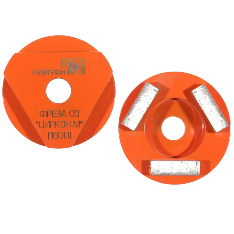 Фрезы «ЦИРКОН- М 1600» - Предназначены для агрессивного быстрого съёма бетона, они дают грубую картину шлифования «обдирка». Форма и расположение сегментов обеспечивают оптимальный вынос шлама. Подложка обеспечивает полную выработку алмазного слоя. Размер сегмента Д×Ш×В – 40×12×8,0+2 (алмазный слой + подложка).