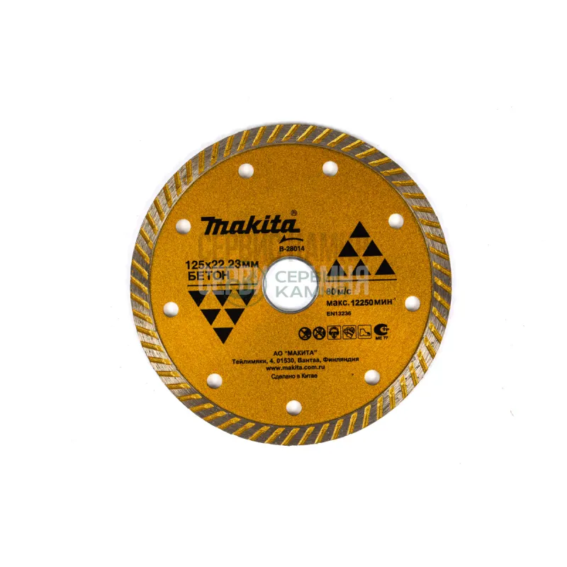 Алмазный диск MAKITA 125х22 мм диаметр 125 мм, посадочный 22.2 мм, сегментный. Диск применим для сухой резки кирпича, бетона, асфальта или мрамора.