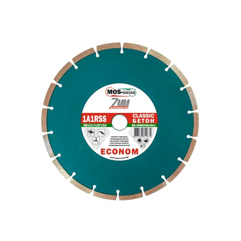 Диск алмазный по бетону, 350 х 7 х 25.4 мм МOS-DISTAR. Диск отрезной алмазный для бензорезов и швонарезчиков. Для «сухой» и «влажной» резки бетона, армированного бетона, камня, тротуарной плитки. Высота алмазной режущей кромки 7 мм, посадочный диаметр 25,4 мм,