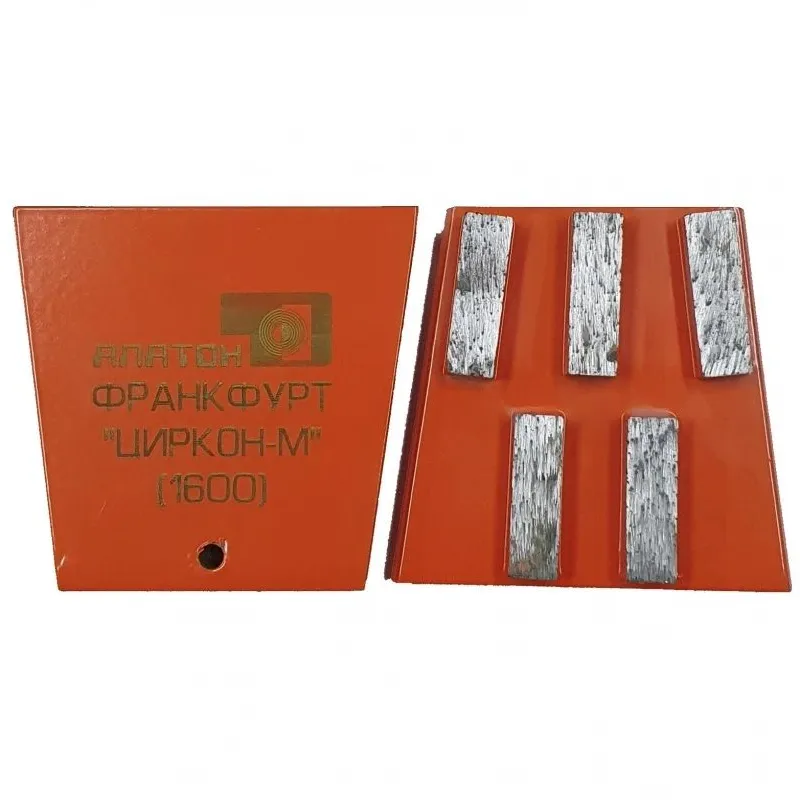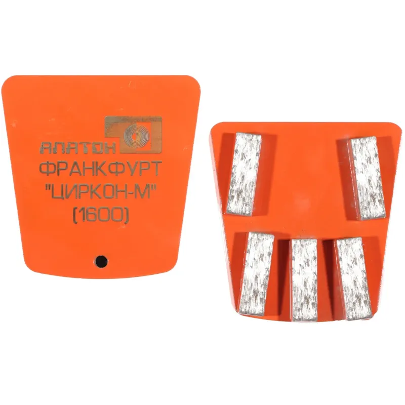 Франкфурты «ЦИРКОН- М 1600» 5 сегментов. Предназначены для агрессивного быстрого съёма бетона, они дают грубую картину шлифования «обдирка».Форма и расположение сегментов обеспечивают оптимальный вынос шлама. Подложка обеспечивает полную выработку алмазного слоя. Размер сегмента Д×Ш×В – 40×12×8,0+2 (алмазный слой + подложка).