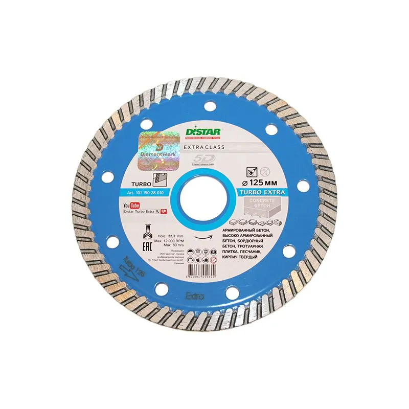Алмазный круг 1A1R 125 Turbo Extra это стандартный диск для ручных инструментов, наружным диаметром 125 мм. Используется в быту и строительстве для резки бетона, высокоармированного бетона, тротуарной плитки и армированного бетона.