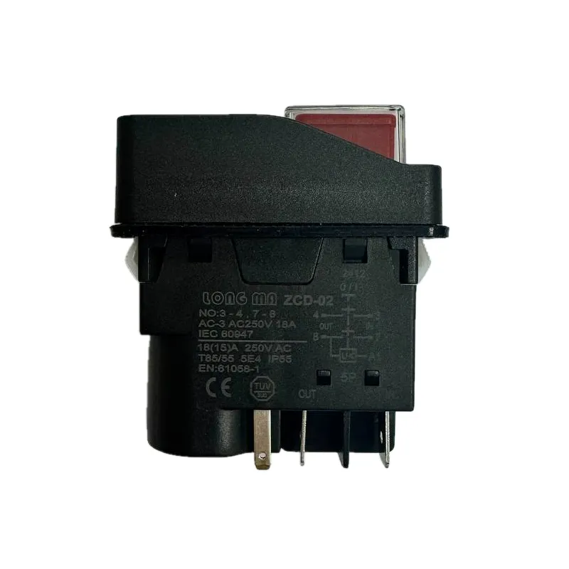 Кнопка включения DKLD DZ-6 со встроенным пускателем применяется для включения техники таких как: точильный и сверлильный станки, пилорама, бетономешалка. Производится в двух вариантах: с 4 и 5 контактами. Пятый контакт заведен на двигатель, на его корпусе есть мини термостат с фиксированной температурой отключения и через термостат, и выполняется функция тепловой защиты двигателя